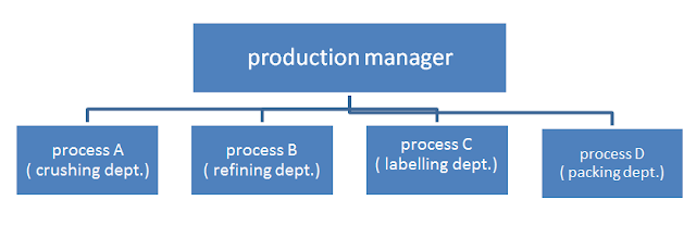 6. Departmentation by process: – this method is mainly used in product oriented industry. In the process of making goods there will be different stage or process. When one process is categorized in one department and next process is categorized in next department, it is known as departmentation by process.