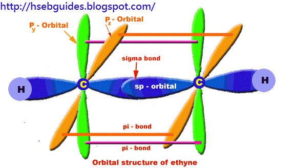 In ethyne molecule, each carbon atom is Sp-hybridized. Due to Sp-hybridization, each carbon atom generates two Sp-hybrid orbitals. In this way there exists four Sp-orbital in ethyne. These Sp-orbital are arranged in linear geometry and 180o apart. Remaining py and pz unhybrid orbitals of each carbon atom lie perpendicular to the plane of Sp-orbitals.