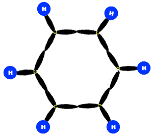 - A hexagon with alternate double and single bonds.