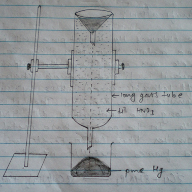 Mercury obtained by above process is not pure and contains impurities like copper (Cu), Zn, Bi, Ag, etc. as impurities. The impure mercury is filtered through daemons leather to remove suspended soiled. After that mercury is dropped through a long tube filled with 5% HNO3 solution. The base metals dissolve in HNO3 as Nitrate.