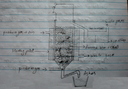 ZnO obtained during roasting is mixed with coke and heated strongly where ZnO is reduced to Zn by carbon.