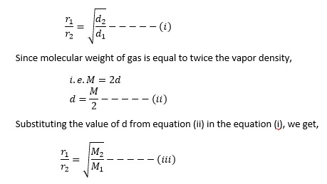 If r1 and r2 are the rates of diffusion of any two gases whose densities are d1 and d2 respectively, then according to this law: