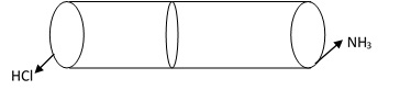 In this experiment a gas tube which is open at both ends is taken. At one end a cotton plug dipped in HCl is fitted and at other end a cotton plug dipped in NH3 is fitted. The vapor of NH3 and HCl diffused in opposite direction, and they form a ring of white dense fune of NH4Cl. It is found that the distance of the ring is closer to the end containing HCl than that of the end containing NH3. This verifies Graham’s Law of Diffusion.