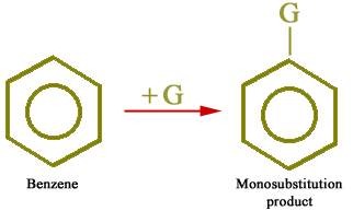 All hydrogen atoms of the benzene ring are equivalent. Therefore, when a group enters into the benzene ring, only one monosubstituted product (C6H5-G) is possible as described below: