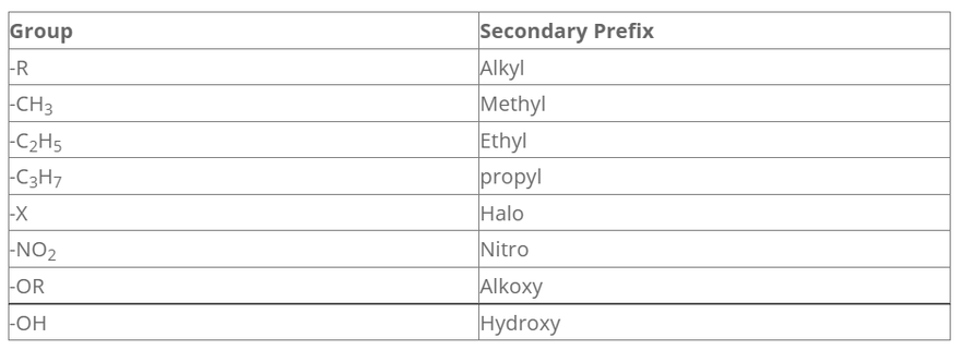 It is used to represent other groups like alkyl group (as a substitute/side chain) and other functional group which are not represented by secondary suffix. It is written before word root if primary prefix is absent otherwise it is written before primary prefix.