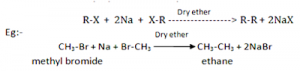 When alkyl halides are heated with sodium metal in the presence of dry ether, alkanes are obtained (generally having double number of C-atoms than in alkyl halides). This reaction is known as Wurtz reaction and used for the preparation of symmetrical alkanes.