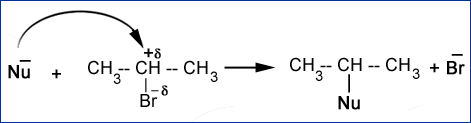 For example in iso propyl bromide, C-atom has partial positive charge and Br-atom has partial negative charge. The C-atom has capability to accept a pair of electrons to form a new bond. In doing so the C-Br bond breakes and Br– leaves the molecules. The net result is that one nucleophile displaces another nucleophile. Such displacement reactions are called nucleophilic substitution reactions.