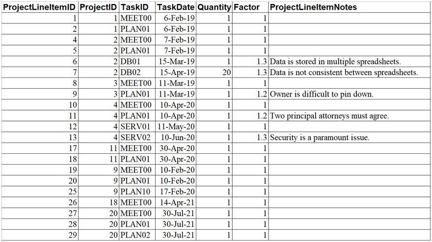 - For the record with a ProjectLineID value of 7, why does the Factor field contain 1.3?