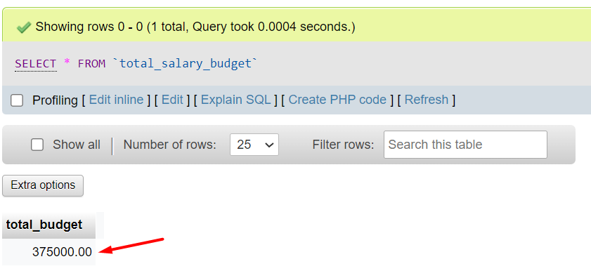 Before writing a query to remove an employee - let's take a minute to review the current total_budget where we can see it's 375,000.00: