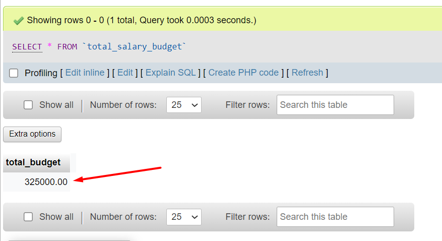 We can indeed see that the total_budget is now 325,000 and as such we can confirm that the trigger did function as was intended.