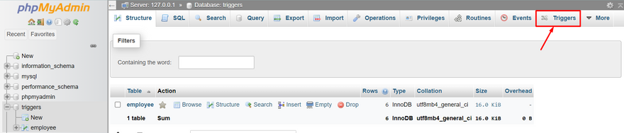 From your phpMyAdmin interface - click on database you're working under. On the page that opens, from top menu bar locate "Triggers" and click on it to find it:
