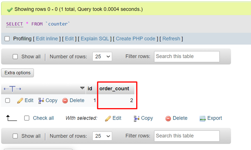 UPDATE counter SET order_count = order_count + 1;