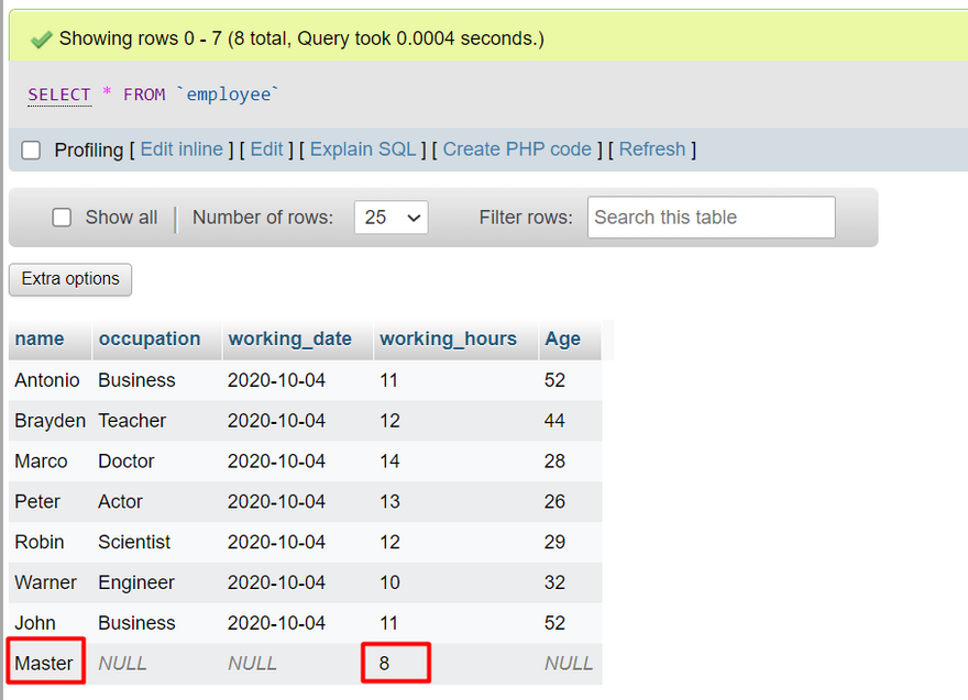 INSERT INTO `employee` (`name`, `occupation`, `working_date`, `working_hours`, `Age`) VALUES