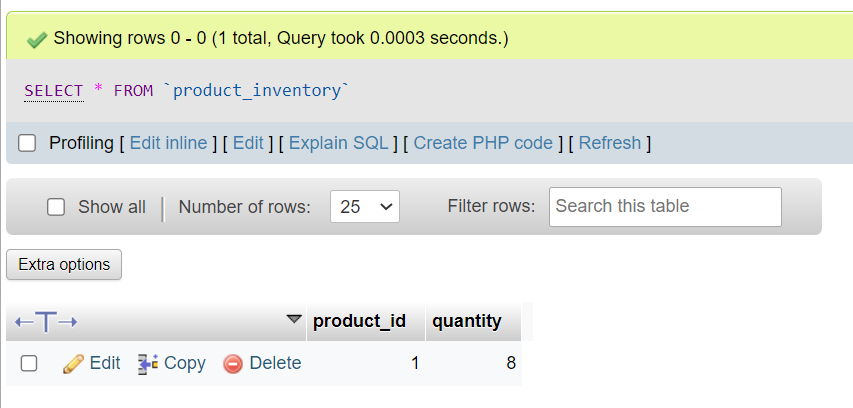The outcome as below shows that the product_inventory table does have quantity increased to 8 instead of previous 5 even if the above UPDATE command was only done for product table, confirming the query action: