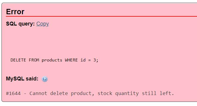 SET MESSAGE_TEXT = 'Cannot delete product, stock quantity still left.';