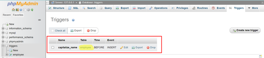 Clicking on it would open interface as below where all the avaiable triggers for the database along with the table those trigger are associated with is displayed:
