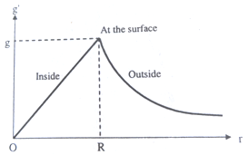 The value of ‘g’ is zero at the centre of the earth. Its value increases from centre to the surface of the earth and becomes maximum at the surface of the earth. On increasing the height, its value decreases. This can be shown by the following graph.