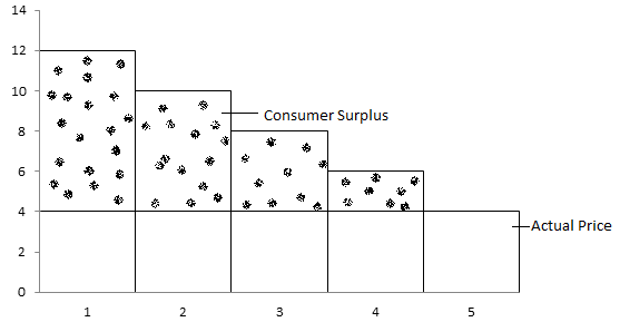 On the above table, when consumer purchase first unit of he/she is ready to pay Rs 12 but actual price is Rs 4. So consumer gets surplus. Similarly, the consumer is trady to pay Rs. 10, 8, 6, 4 for 2, 3, 4, and 5th commodity where actual price is Rs 4 and he/she gets 6, 4, 2, and 0 surpluses respectively. Hence, total consumer surplus = T.U – T.E = 40 – 20 = 20.