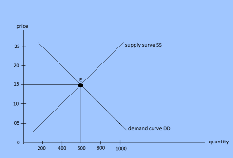 In the given figure, x-axis represents quantity and y-axis represents price of the commodity.DD is demand curve and SS is supply curve. The marker is in equitation at point E where quantity demanded is equal to quantity supplies. Thus equilibrium price and output are determined at Rs 15 and 600 kg respectively. There will be excess supply over the price Rs 15 and pressure to fall unless the quantity demanded becomes equal to quantity supplied. Likewise, there will be excess demand over supply at price less than Rs 15 so there is pressure on price to rise unless and until the quantity demanded becomes equal to quantity supplied. Thus, in a perfect competitive market price is determined through the forces of market demand and supply of the commodity.