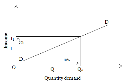 On the above figure x and y-axis measures quantity demand and income respectively. DD is demand curve. In initial stage, income and demand is OI and OQ. When income is increased from I to I1 by 5% then demand is increased from Q to Q1 by 10%. This case is known is income elasticity of demand greater than one.