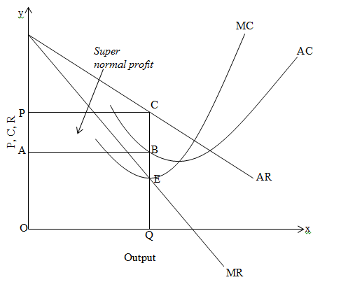 On the above figure, output is measured along x-axis and P, C, R are measured on y-axis. At the point E, both conditions for the equilibrium are satisfied so that E is the equilibrium point. If we draw a straight line from point E towards x-axis we will get equilibrium output i.e. OQ. If we draw straight line from point E towards AR curve we will get AR or equilibrium price i.e. CQ or OP. While deriving the straight line from point E towards AR curve, the line cuts AC curve at point B. So, average cost of the firm to produce the output is BQ or OA. In this condition total revenue of the monopolist is OPCQ and total cost is OABQ. So, it gets super normal profit equal to area ABCP.