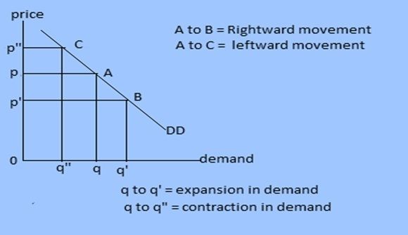It is the graphical representation of expansion in demand brought by fall in price, other things remaining constant. If price falls, consumes demand more. It is called expansion in demand. It is shown by movement from a point in left side to another point in right side of same demand curve.