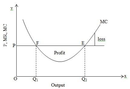 On the above figure, output is measured on x-axis whereas price, marginal revenue and marginal cost is measured on y-axis. At point F, MR and MC are equal and MC cuts MR from above so that point F is not the equilibrium point because if the producer produces more than Q1 then profit amount is increased. So, he wants to produce more which is against equilibrium position. But point E is equilibrium position because if he produces more than Q2 there is no chance of profit. So, producer wants to remain at point E by producing Q2 output which gives maximum revenue and MC = MR when MC cuts MR from below.