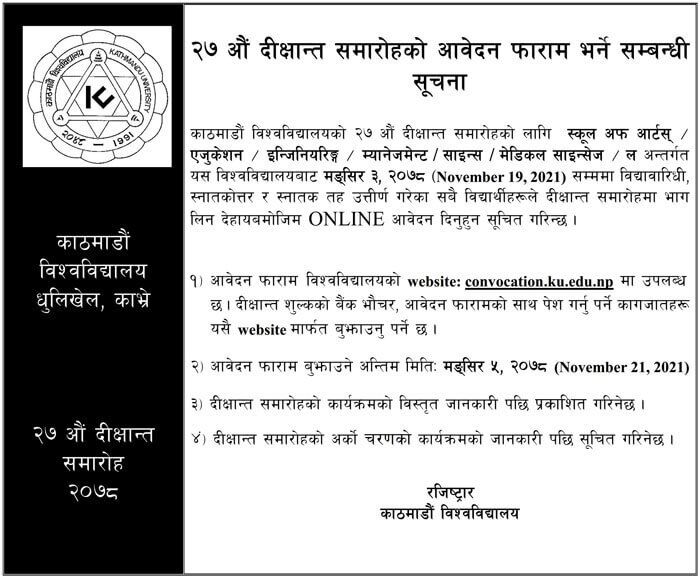 Kathmandu University (KU) , Dhulikhel, Kavre has published form fill-up notice to participate in 27th Convocation Ceremony.