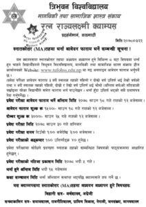 Admission announcement for MA are now open at Tribhuvan University’s Faculty of Humanities and Social Sciences, Ratna Rajya Laxmi Campus, Exhibition Road, Kathmandu.