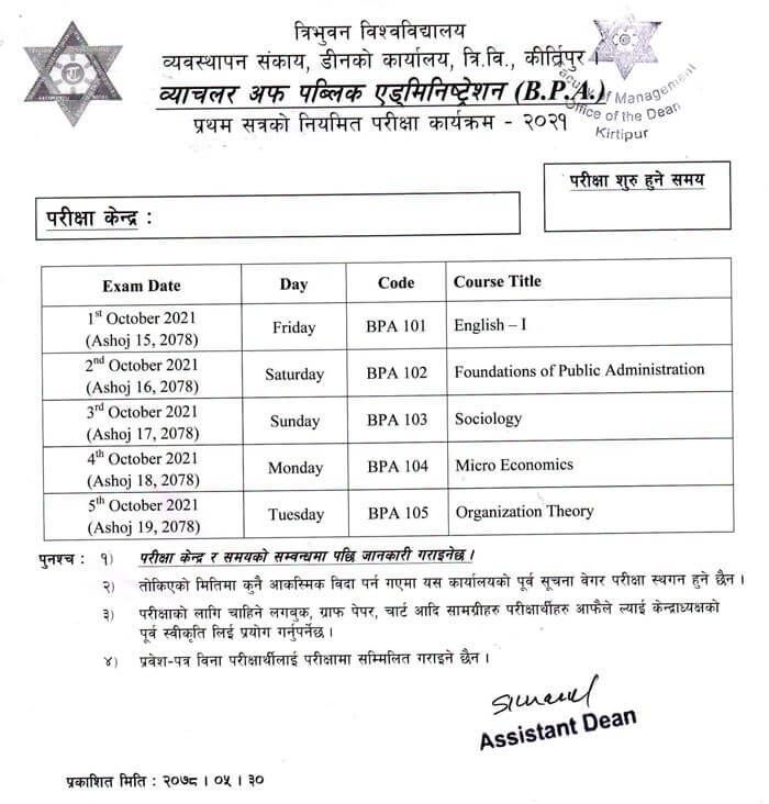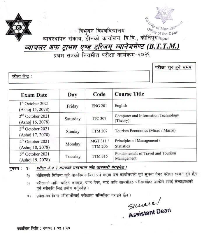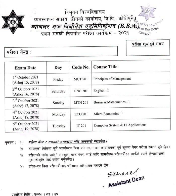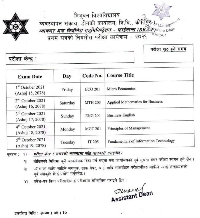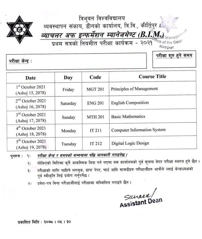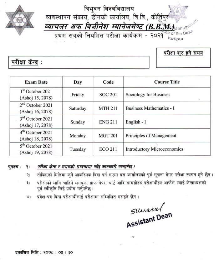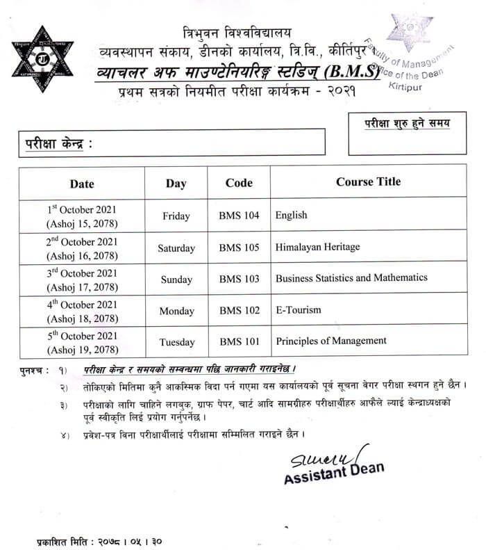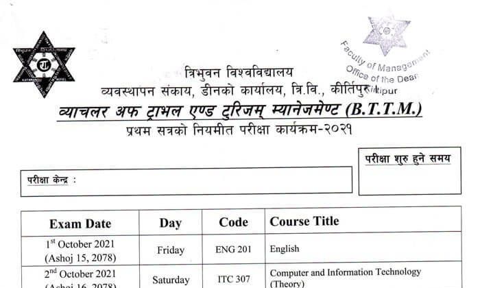 Tribhuvan University (TU) has published examination routine for the First semester Regular Examination 2021 of following Bachelor level programs: