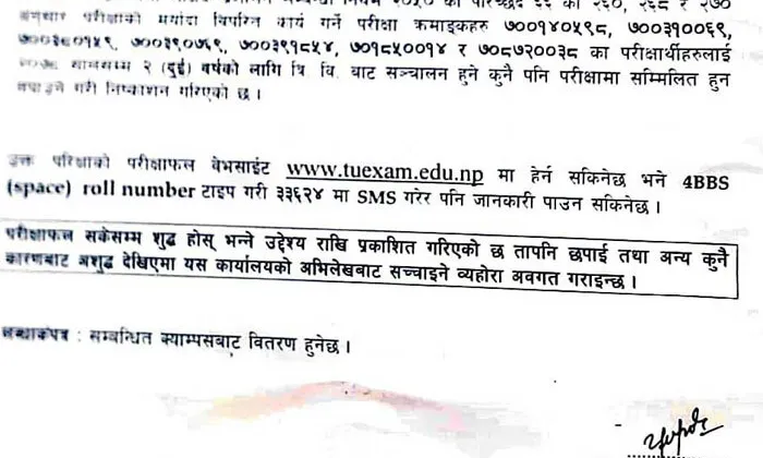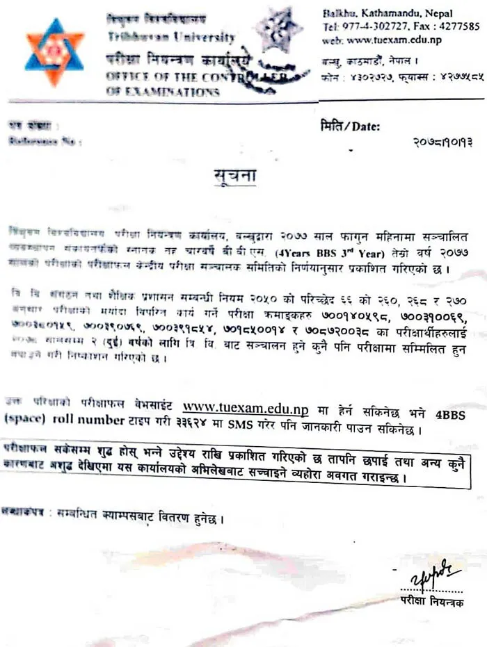 The examination results of 4 Years, Bachelor of Business Studies (BBS) Third Year 2077 have been announced by Tribhuvan University’s Office of the Controller of Examinations in Balkhu.