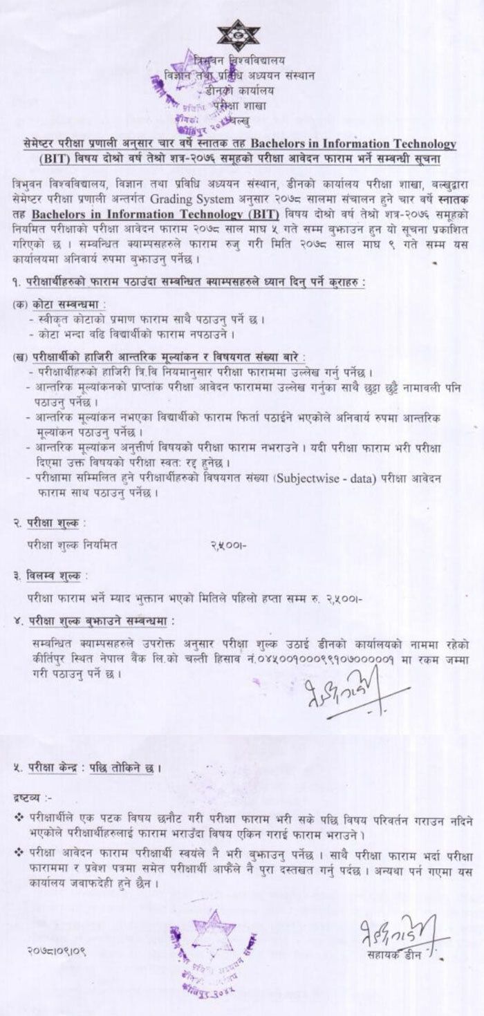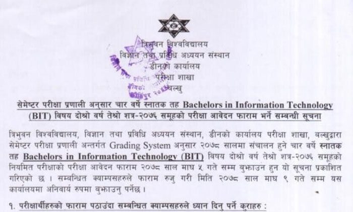 The Dean office of Tribhuvan University’s (TU) Institute of Science and Technology, Kirtipur, has issued a notice for semester level examination form filling for Bachelors in Information Technology (BIT), third semester, 2076 batch.
