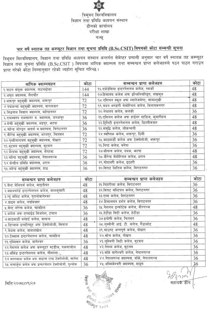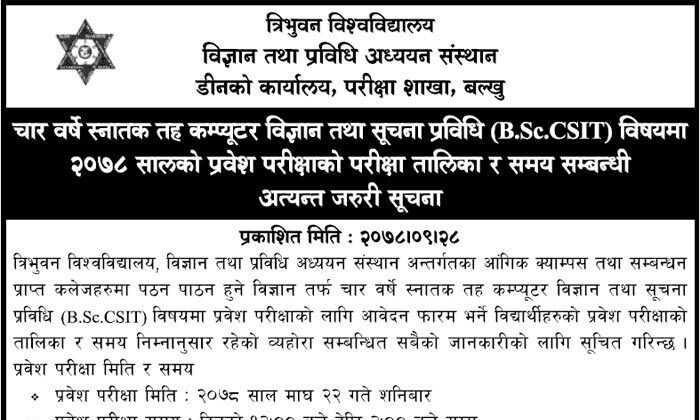 The Office of the Dean, Examination Branch, Balkhu, Tribhuvan University (TU) , Institute of Science and Technology (TUIoST), has published a notice regarding the BSc Computer Science and Information Technology (BSc CSIT) entrance exam schedule (Date and Time) 2078.