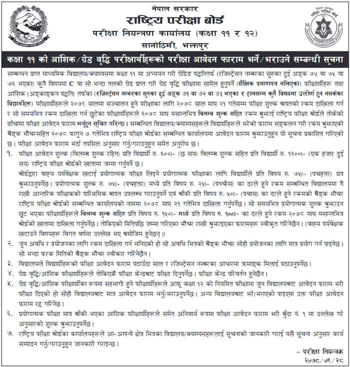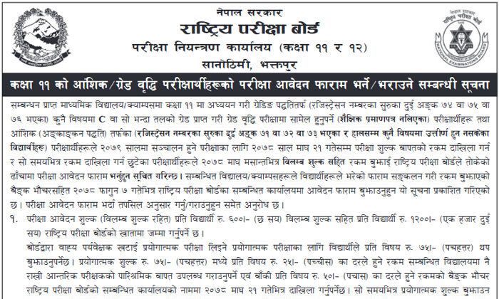 Class 11 partial and grade increase examination form filling notification has been published by the National Examination Board (NEB) Examination Control Office (Class 11 and 12), Sanothimi, Bhaktapur.