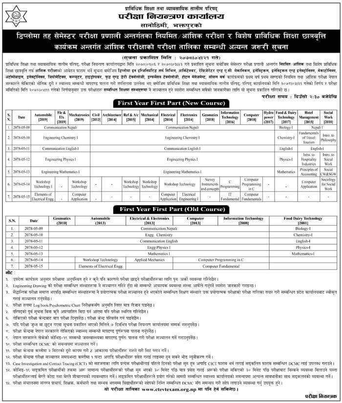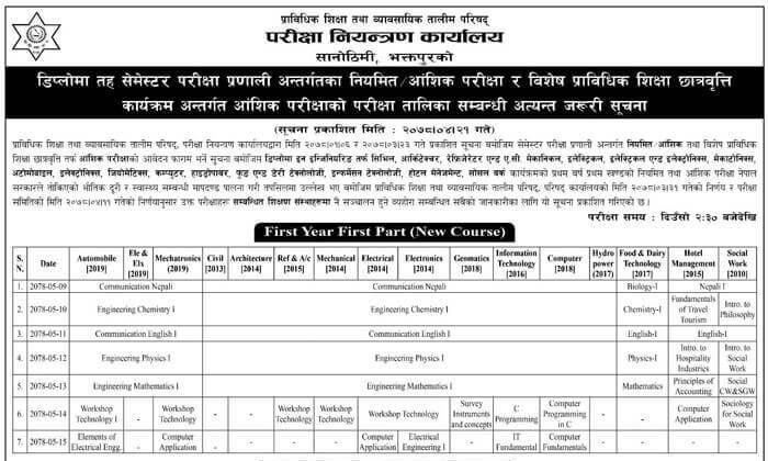 The Examination Controller Office of the Council for Technical Education and Vocational Training CTEVT, Sanothimi, Bhaktapur, has published the examination schedule for Diploma level semester system for both regular and partial examinations as well as partial examinations of special technical scholarships.
