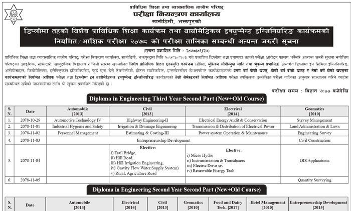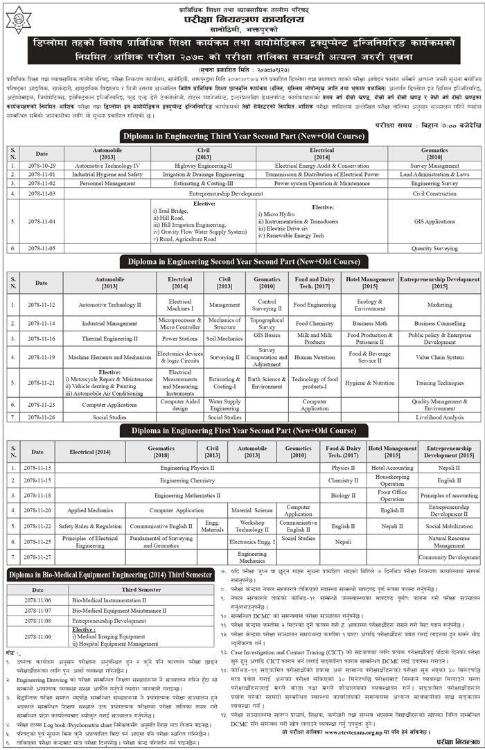 Examination schedules for the special technical education examination and biomedical equipment engineering programs for regular and partial examinees have been announced by the Council for Technical Education and Vocational Training, Office of Controller of Examination, Sanothimi, Bhaktapur.