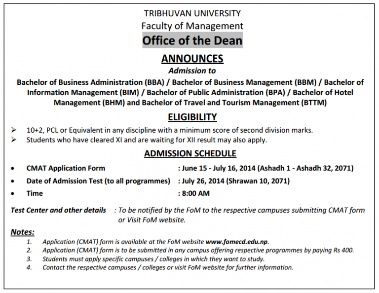 Tribhuwan University (TU) today announced the opening of the forms for the entrance exam of CMAT for the programs like BBA, BHM, BBM, BIM, BPA and so on.
