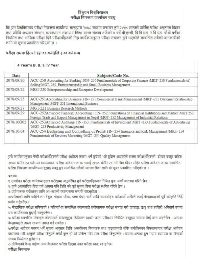 The examination schedule for the 4 years Bachelor of Business Studies (BBS) Fourth Year 2078 regular and partial examination has been issued by the Tribhuvan University (TU) office of the controller of examinations in Balkhu.