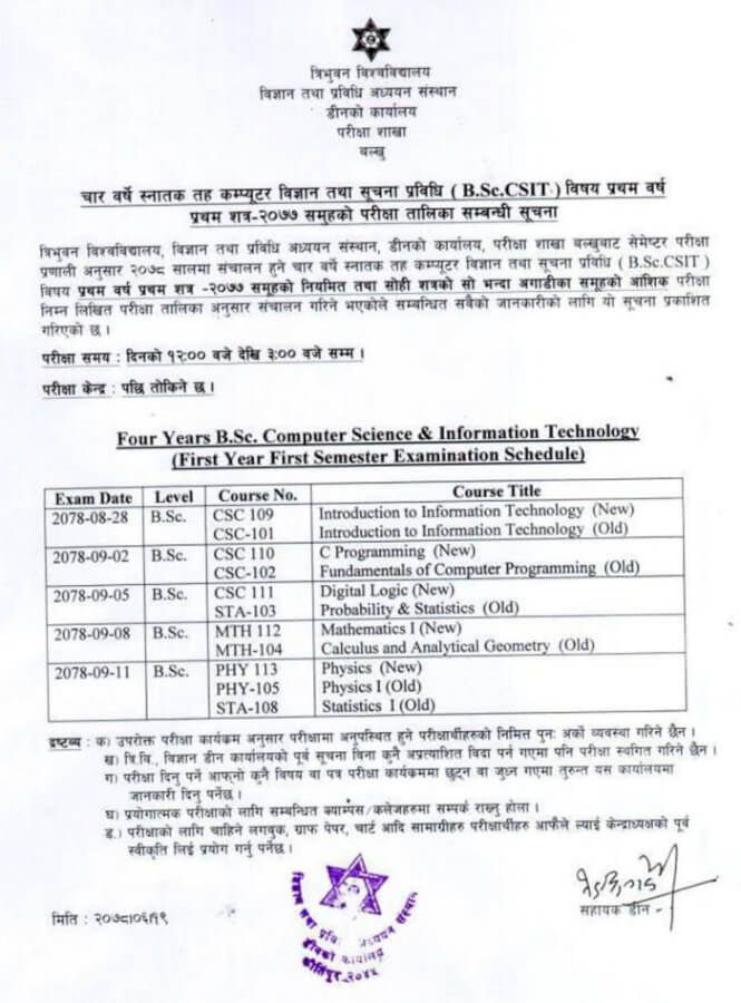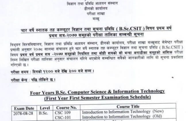 The exam routine for the first semester of the Bachelor of Science in Computer Science and Information Technology has been issued by Tribhuvan University’s (TU) Institute of Science and Technology’s Dean’s Office, Examination Department Balkhu (BSc. CSIT).