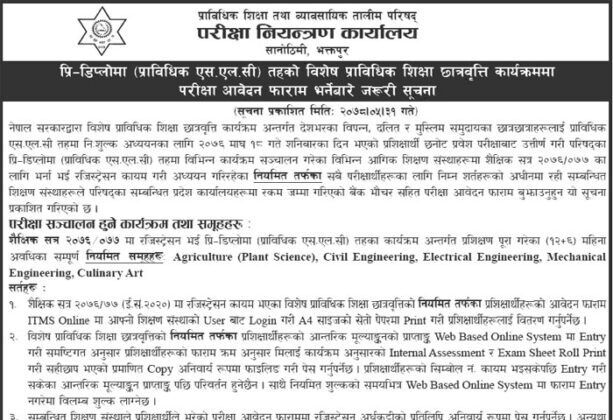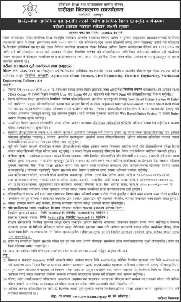 The Office of Examination Control (OCE) of the Council for Technical Education and Vocational Training (CTEVT) , Sanothimi, Bhaktapur, has issued an urgent notice about filling out the examination application form for the special technical education scholarship program at the pre-diploma (technical SLC) level.