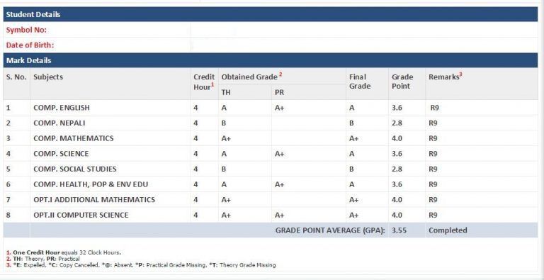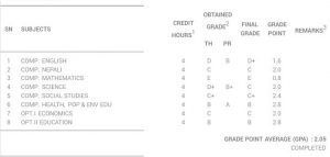 However, can he/she study Nepali? The requirement for Nepali is minimum GPA of 1.6, ‘C’ or better in Nepali, ‘D+’ or better in English and Social. Now, let’s see how the person does. He/she obtained 2.05 GPA which is above required 1.6. He/she obtained ‘C’ grade for Nepali which is just at the minimum required. He also has D+ in English which is also just about enough to get through. And, the person surpasses the final requirement of grade score of D+ or better in Social with C+. So, he can study in Nepali faculty.