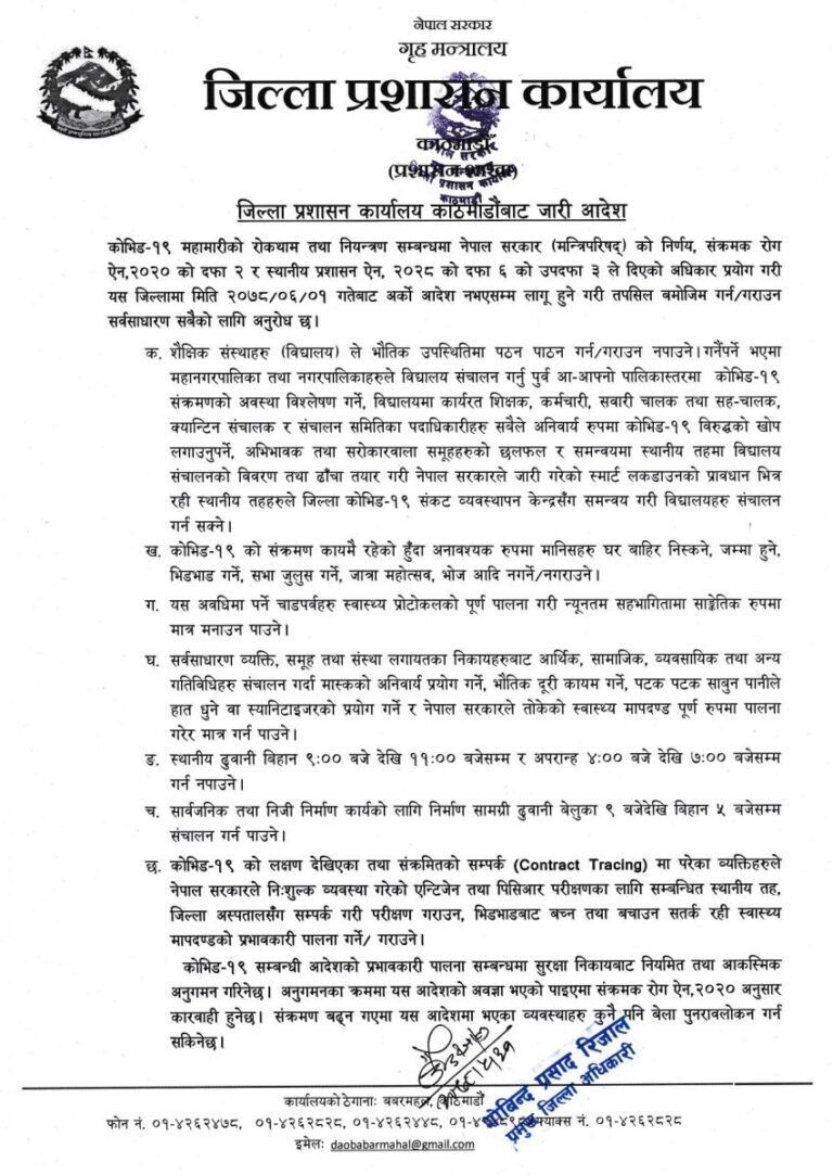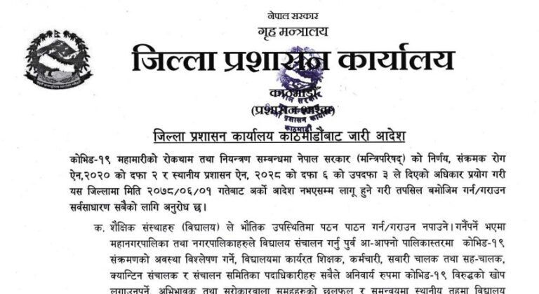 Local transportation will also be permitted only between the hours of 9 a.m. and 11 a.m. and 4 p.m. and 7 p.m. Those who break the order will face consequences, according to the Kathmandu DAO.