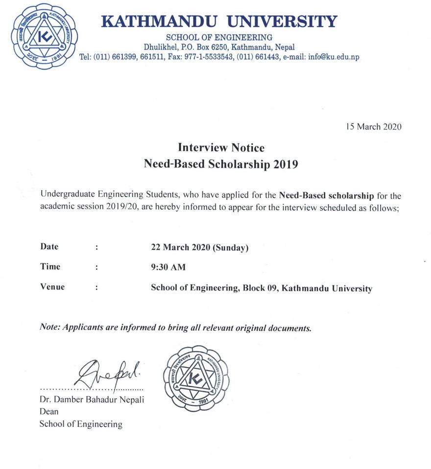 Kathmandu University, School of Engineering Dhulikhel has published the Interview Call for the Undergraduate Students of School of Engineering. It is for those students who have applied the Need-Based Scholarship for academic Session 2019/20. See the Notice Down Here.