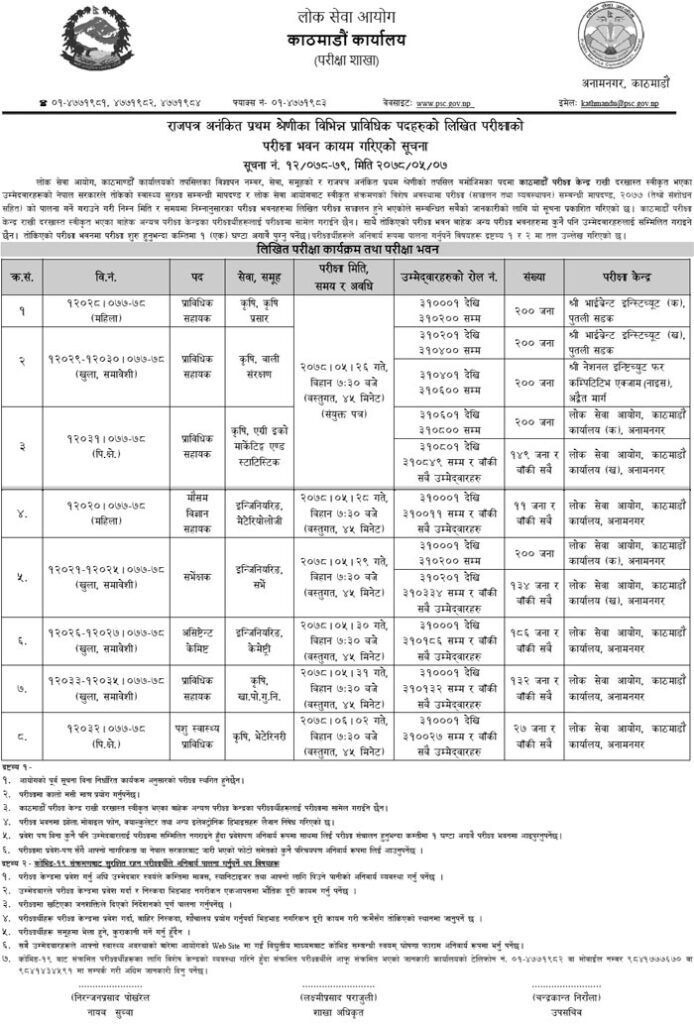 Exam center notices for candidates for various Advertisement No., Service Group, Non-Gazetted Prabidhik Nayab Subba First Class (Technical – Prabidhik Sahayak) jobs have been published by the Public Service Commission (Lok Sewa Aayog) Kathmandu Office.