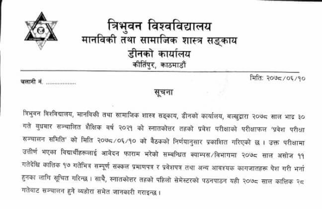 The Dean office of Tribhuvan University’s (TU) Faculty of Humanities and Social Sciences in Kirtipur has released the Master of Arts (MA) entrance test results for the academic year 2021.