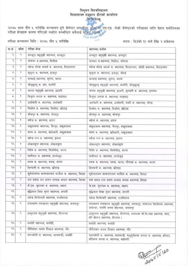 The second-semester examination centers for the Master of Education (M.Ed) program (regular and partial) as well as open and distance learning (ODL) for the year 2078 have been issued by Tribhuvan University (TU) , Faculty of Education, Dean’s Office, Kirtipur.