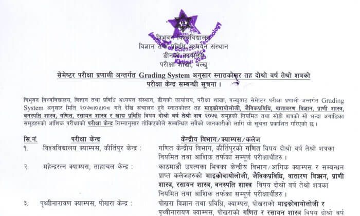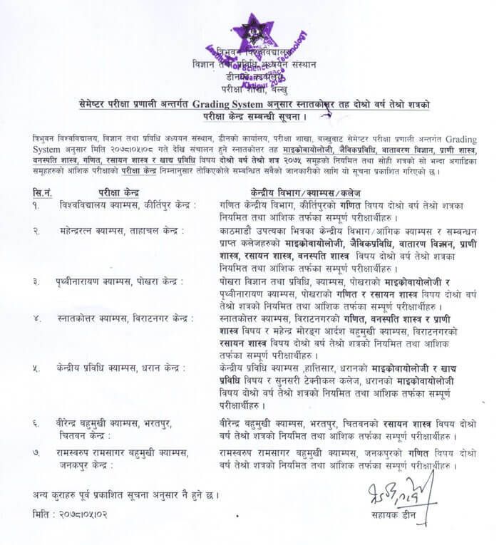 The examination centers for the third semester of several MSc. programs have been issued by Tribhuvan University, Institute of Science and Technology, Dean’s Office, Examination Department, Balkhu.