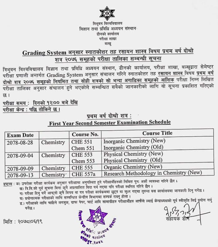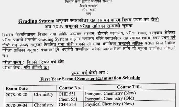 The examination routines for the MSc. Chemistry Second Semester have been issued by the Dean’s Office of Tribhuvan University’s (TU) Institute of Science and Technology’s Examination Department.