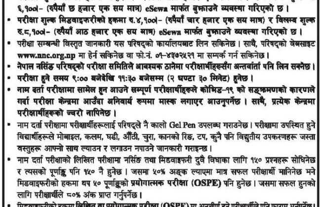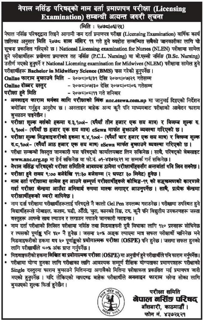 For the year 2078, the Nepal Nursing Council has issued an examination form filling notice for the National Licensing Examination for Nurses (NLEN) and National Licensing Examination for Midwives (NLEM).