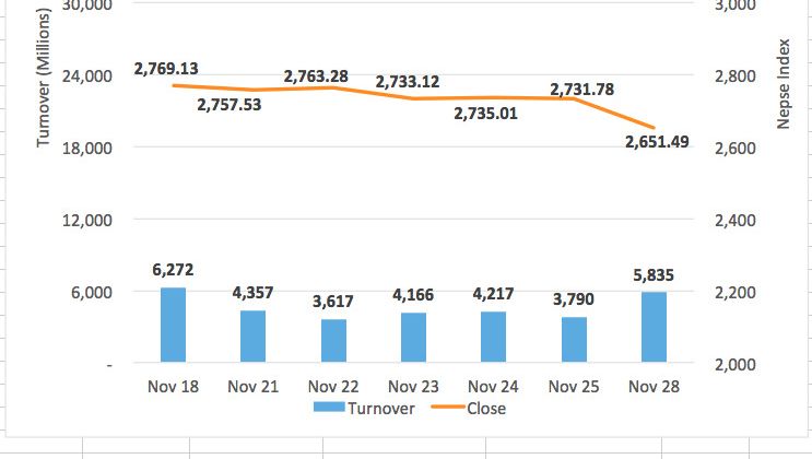 All sectors had significant drops, with the Trading and Development bank sub-indices each losing more than 5%. The sub-indices for Hotels & Tourism and Hydropower both fell more than 4%. All other sectors experienced a strong closing to the downside.